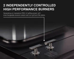 Instant searing thanks to 23MJ of power. 2 chrome plated contemporary taps put variable flame control at your fingertips.