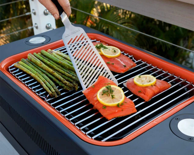 - Integrated retractable rotisserie poles with adjustable heights.