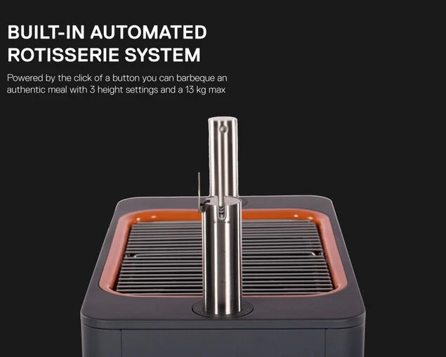 Built-in rotisserie system is powered by a discrete motor, with multi-level height adjustment and 15kg capacity. Includes 2 Cliplock Forks with compact internal storage.